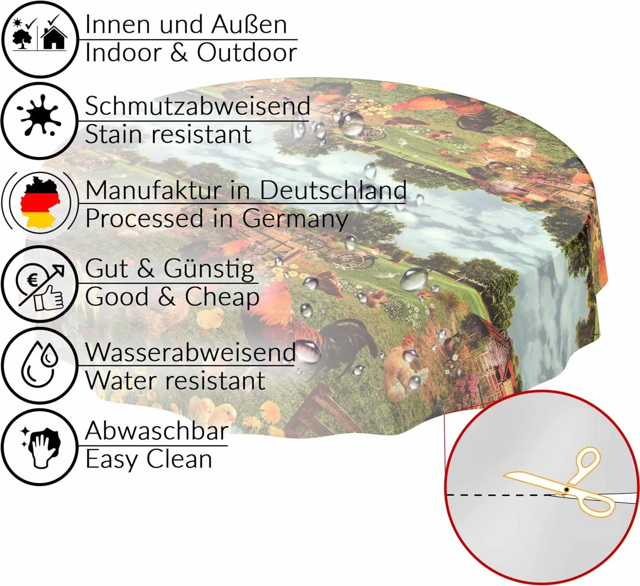 | Produkttyp | Wachstuch-Tischdecke (rund) |