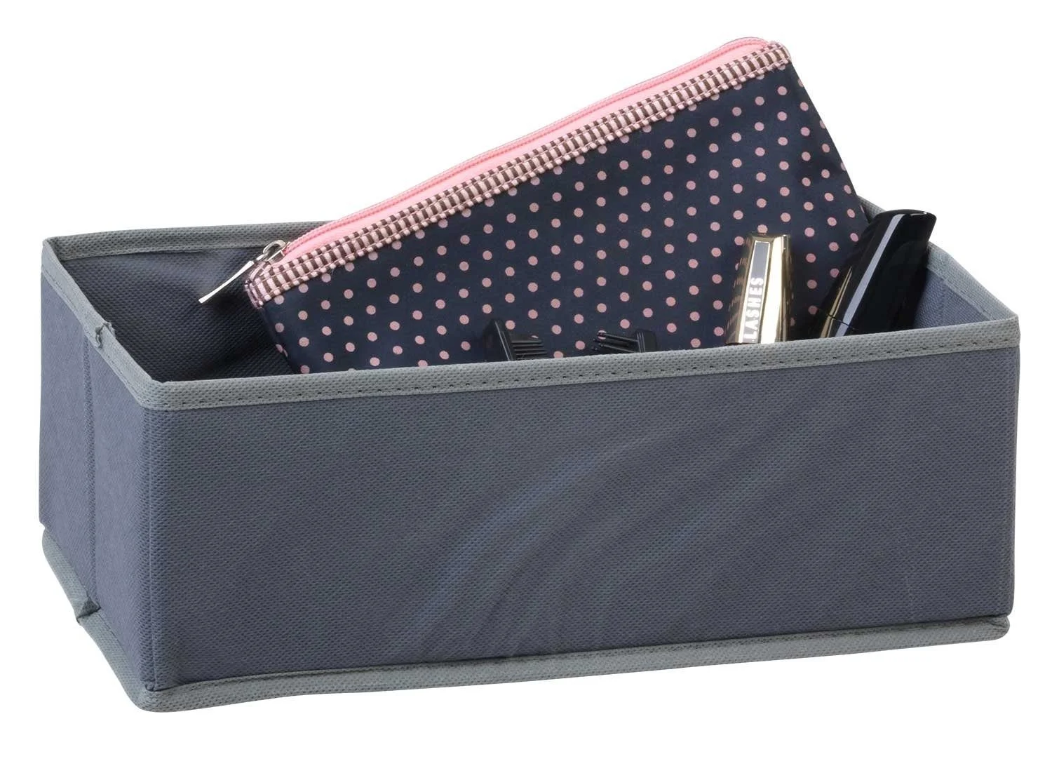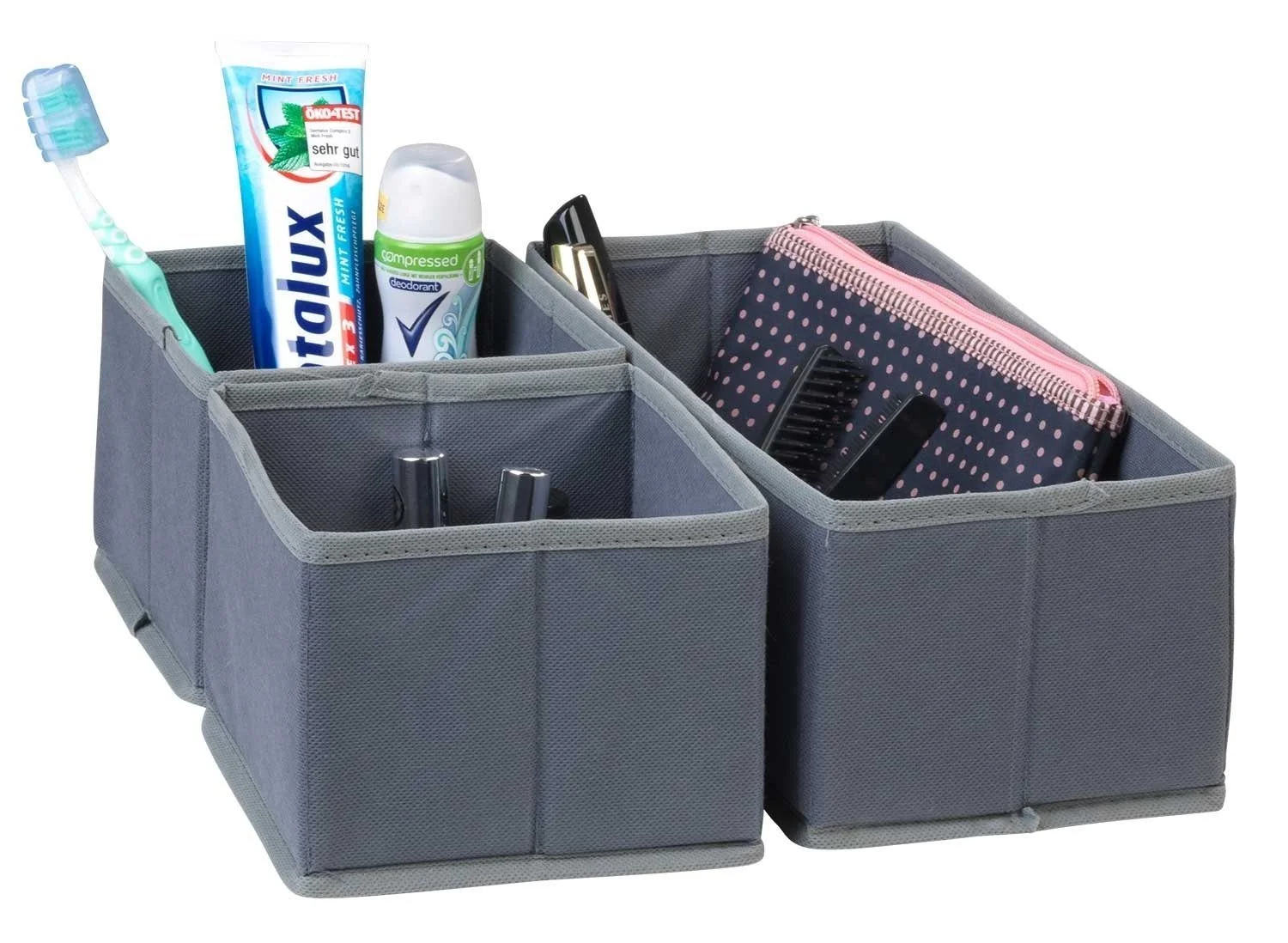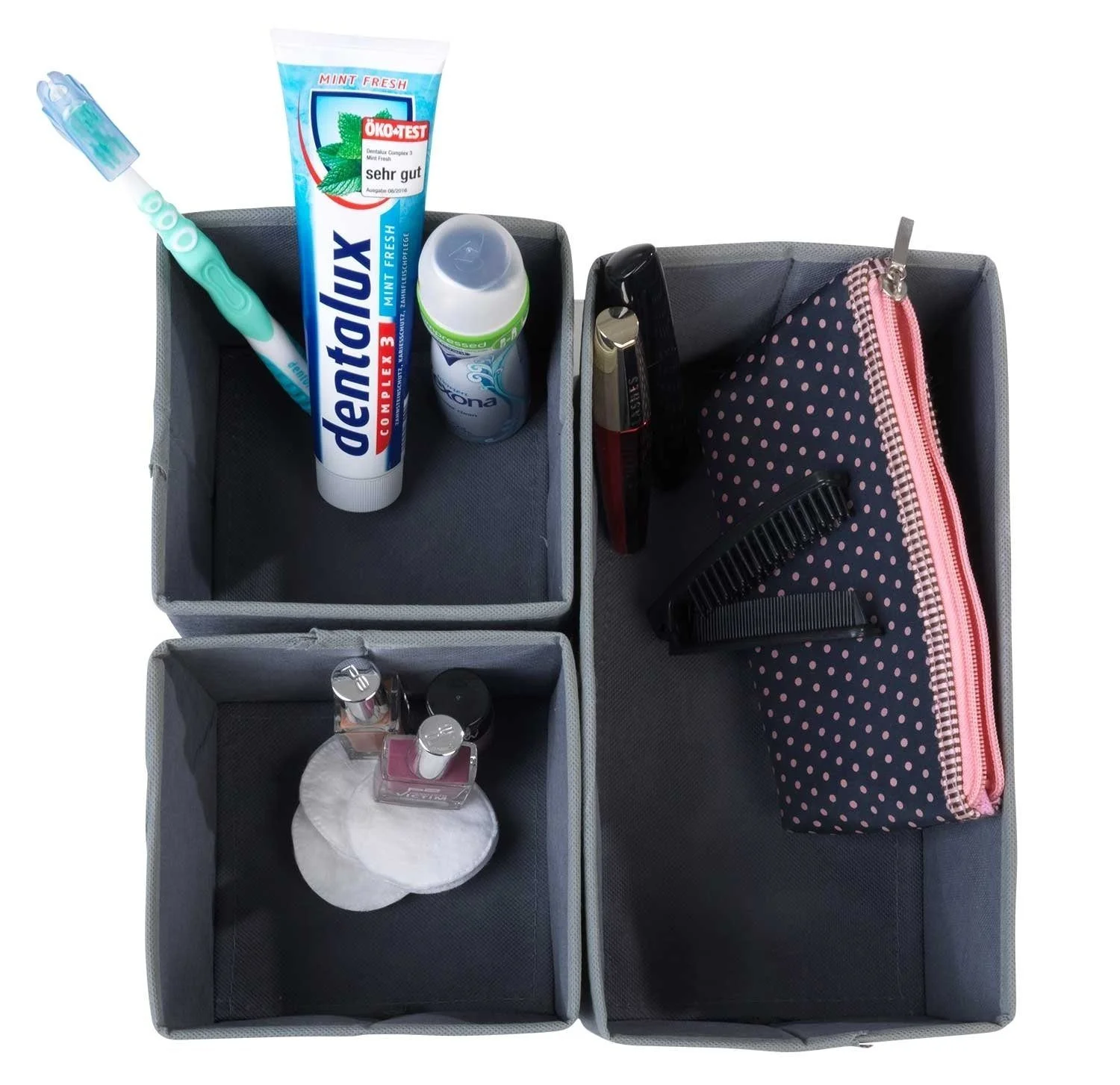 Das Set enthält zwei kleinere quadratische Boxen sowie eine größere rechteckige Box. Die schlichte Farbe fügt sich unauffällig in jedes Wohnkonzept ein – ob im Kleiderschrank, Regal oder auf der Kommode.