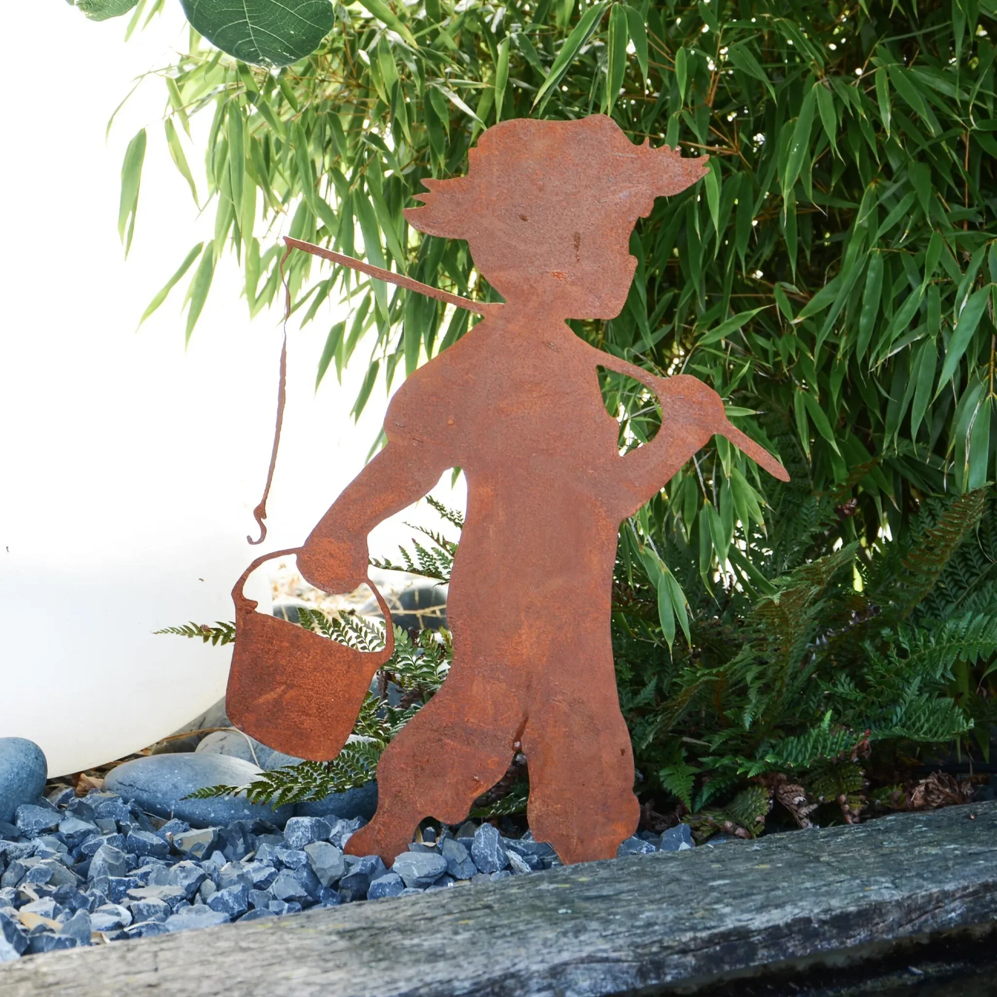 Edelrost Gartenstecker „Kind mit Angel & Eimer“ – 49 cm