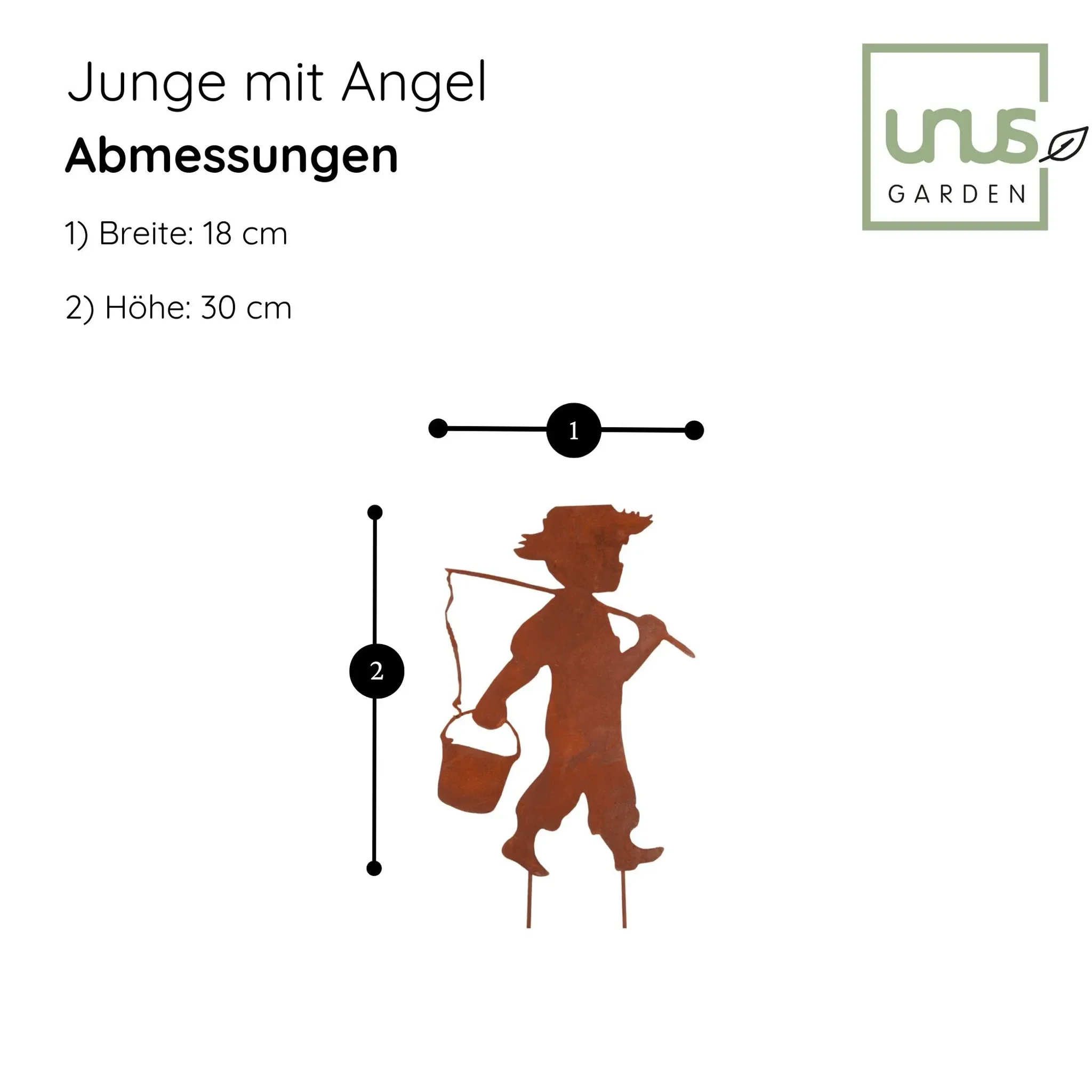 Lieferumfang: 1x Gartenstecker „Kind mit Angel“, rostige Ausführung