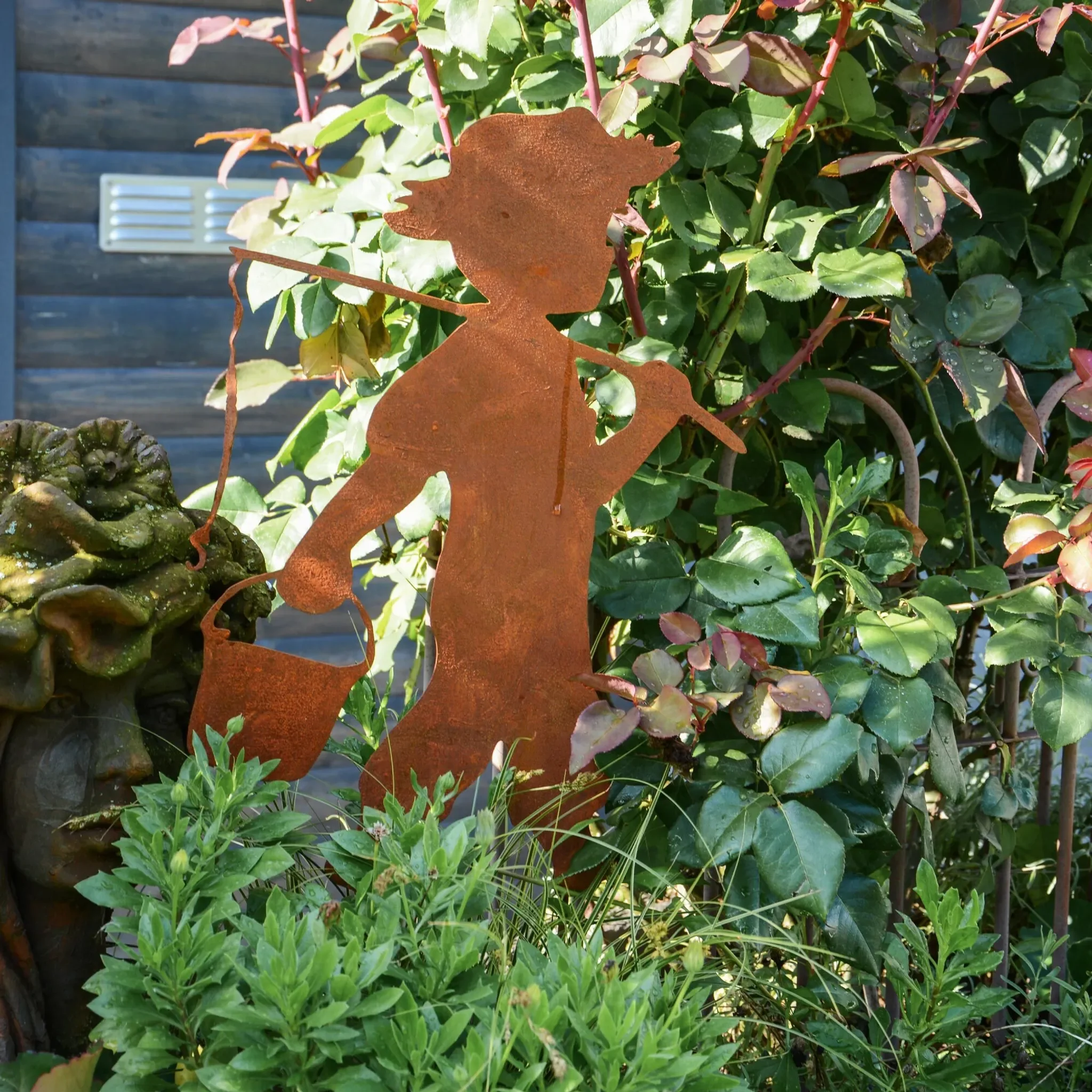 Der RM Design Gartenstecker „Kind mit Hut, Angel & Eimer“ ist eine liebevolle Dekoidee für Garten, Balkon, Terrasse oder Blumentöpfe. Das robuste Edelrost-Metall in natürlicher Rostoptik macht den Stecker zu einem stilvollen Blickfang, der sich ganzjährig draußen verwenden lässt – frostfest & witterungsbeständig.