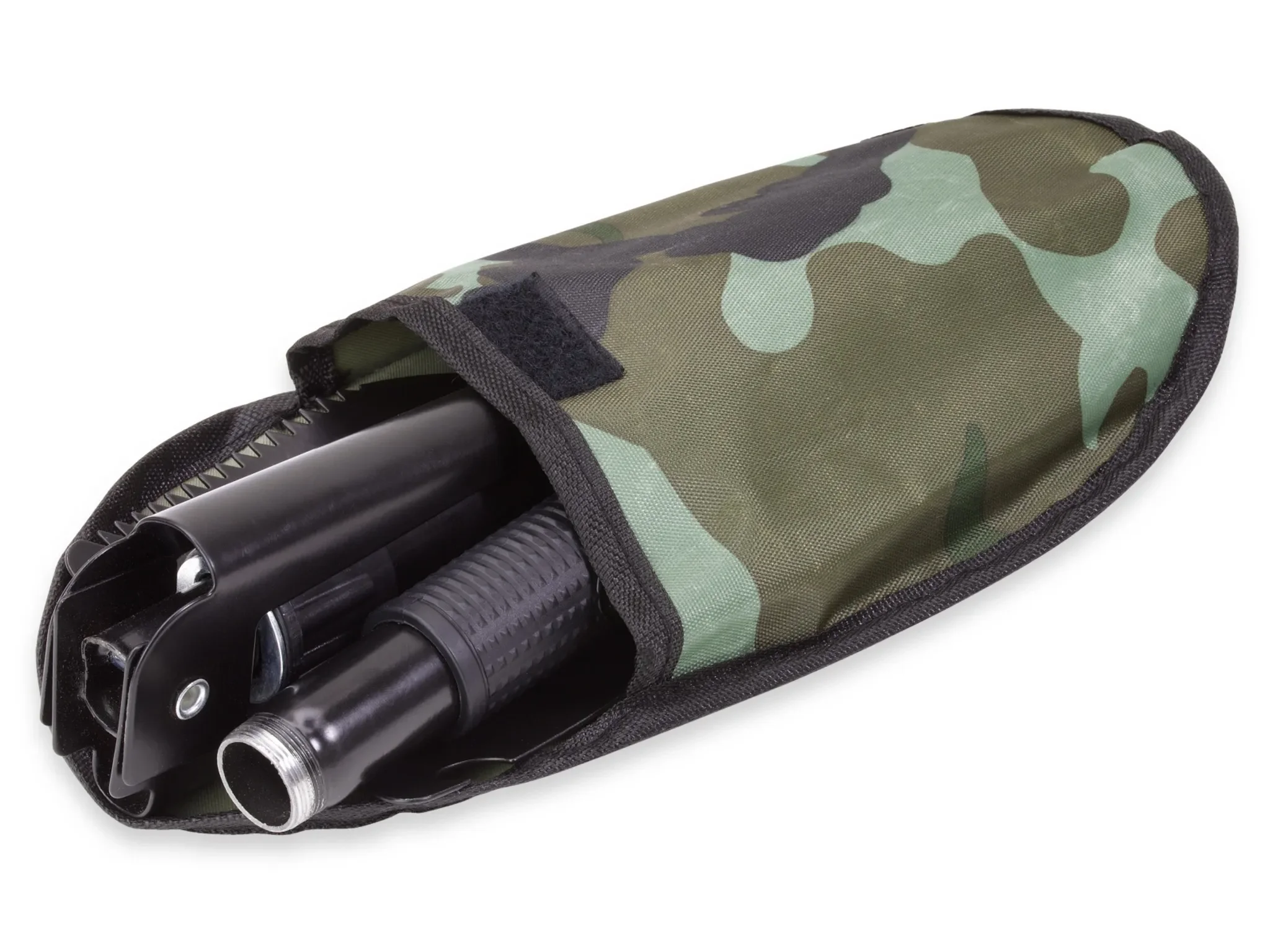 Dank der gummierten, rutschfesten Griffoberfläche liegt der Spaten sicher in der Hand. Mit wenigen Handgriffen lässt sich der Griff abnehmen und der Spaten platzsparend zusammenklappen. Geliefert wird er in einer robusten, tarnfarbenen Polyester-Tragetasche mit Gürtelschlaufe – für maximalen Komfort unterwegs.