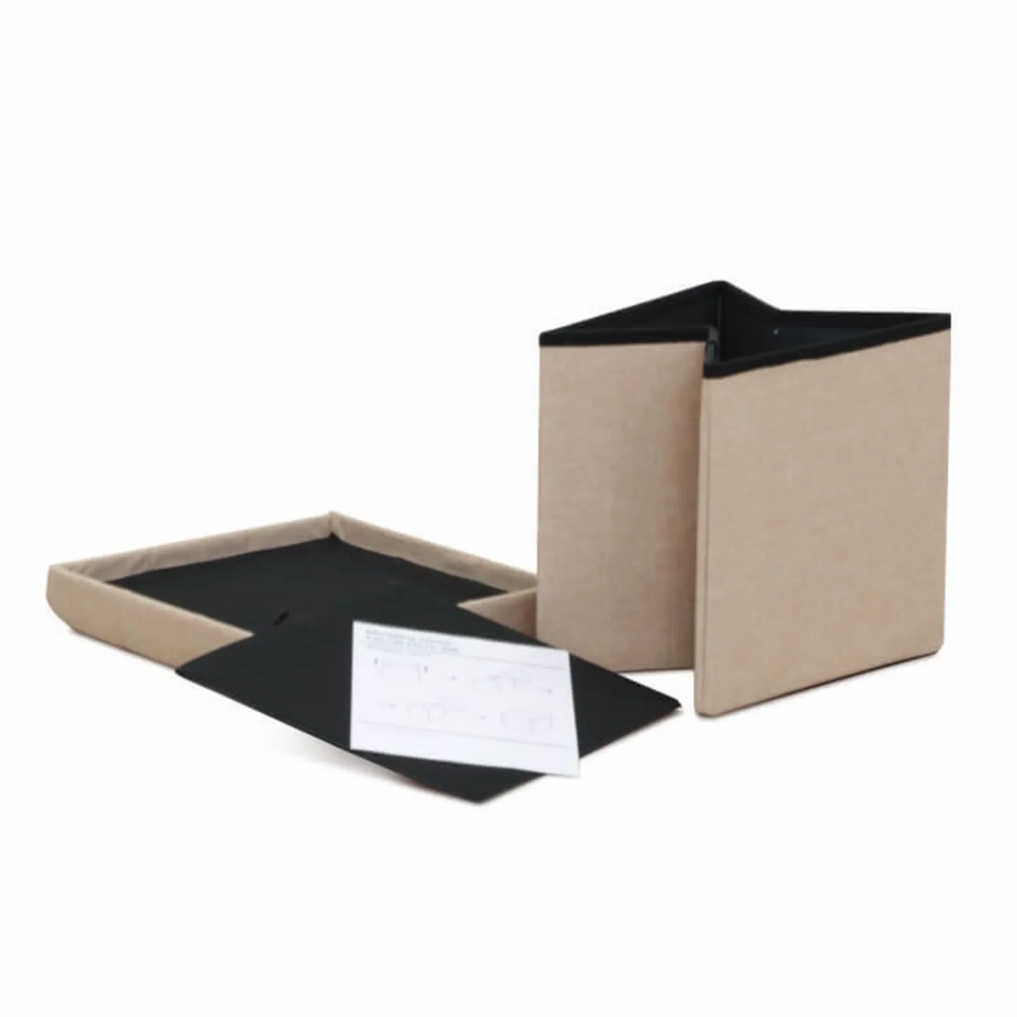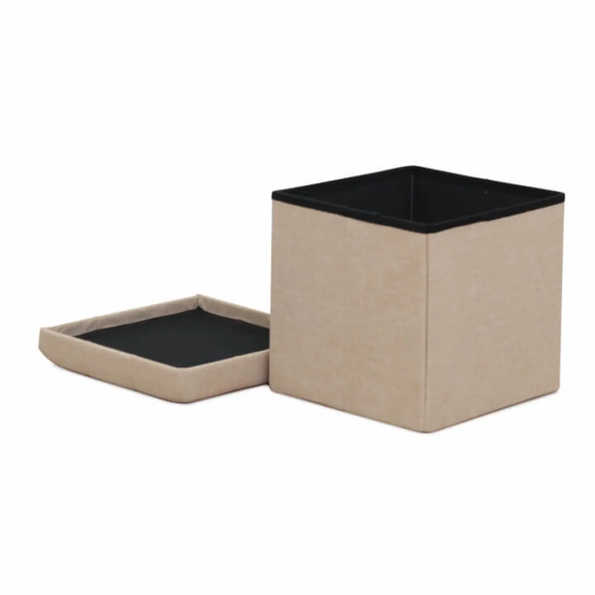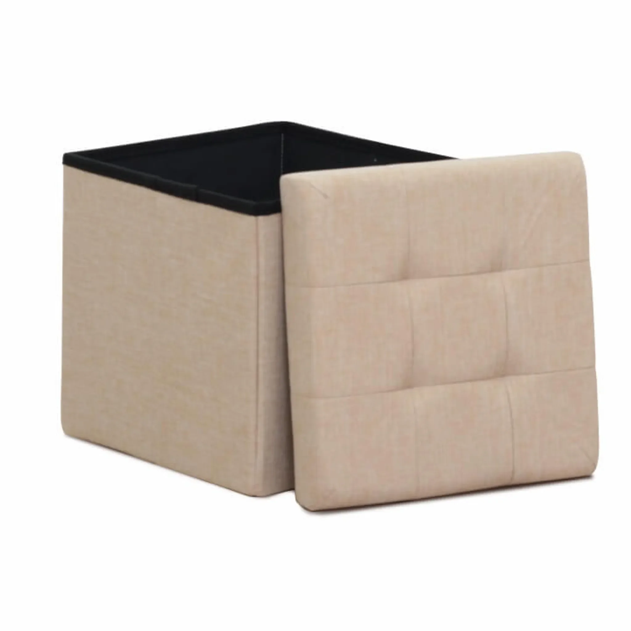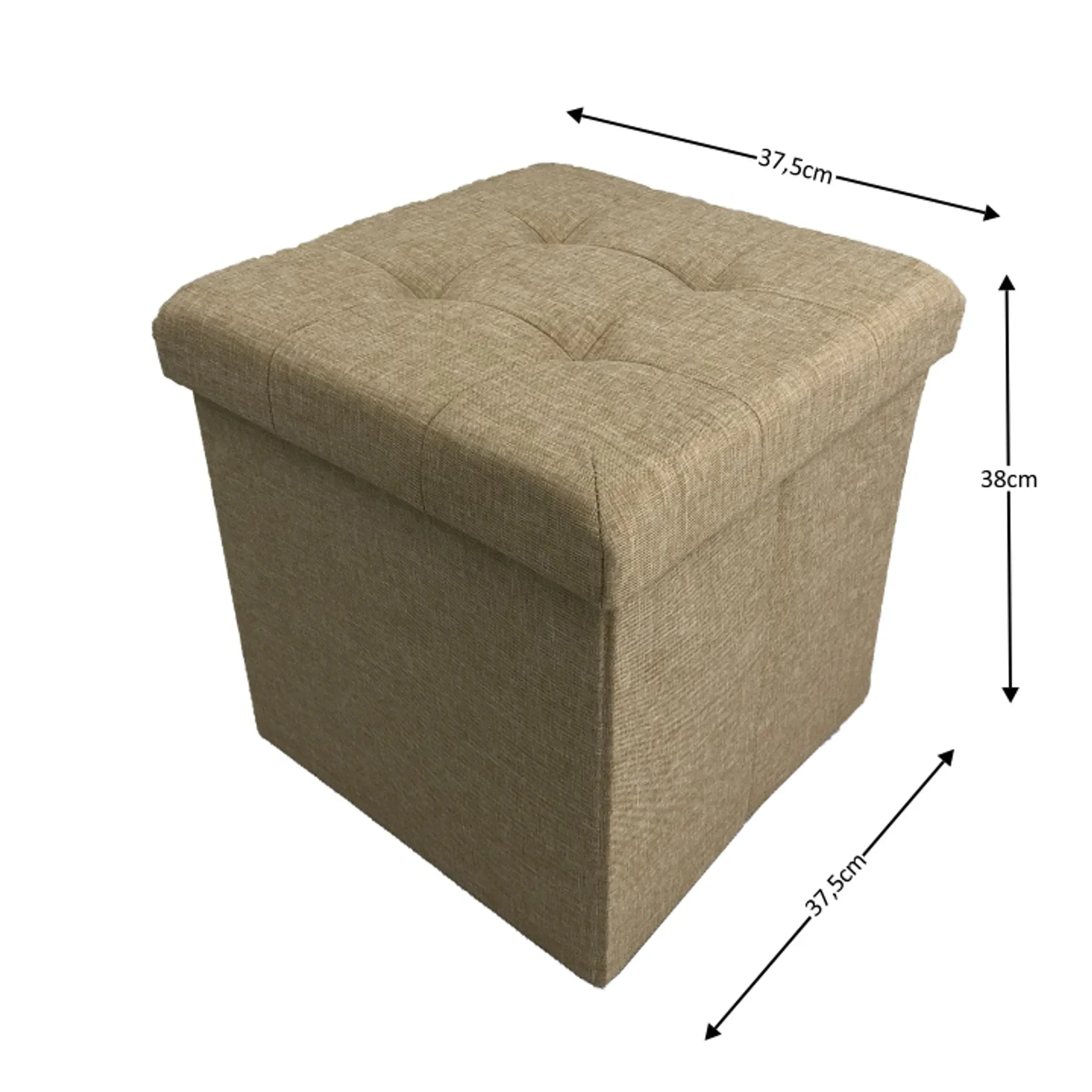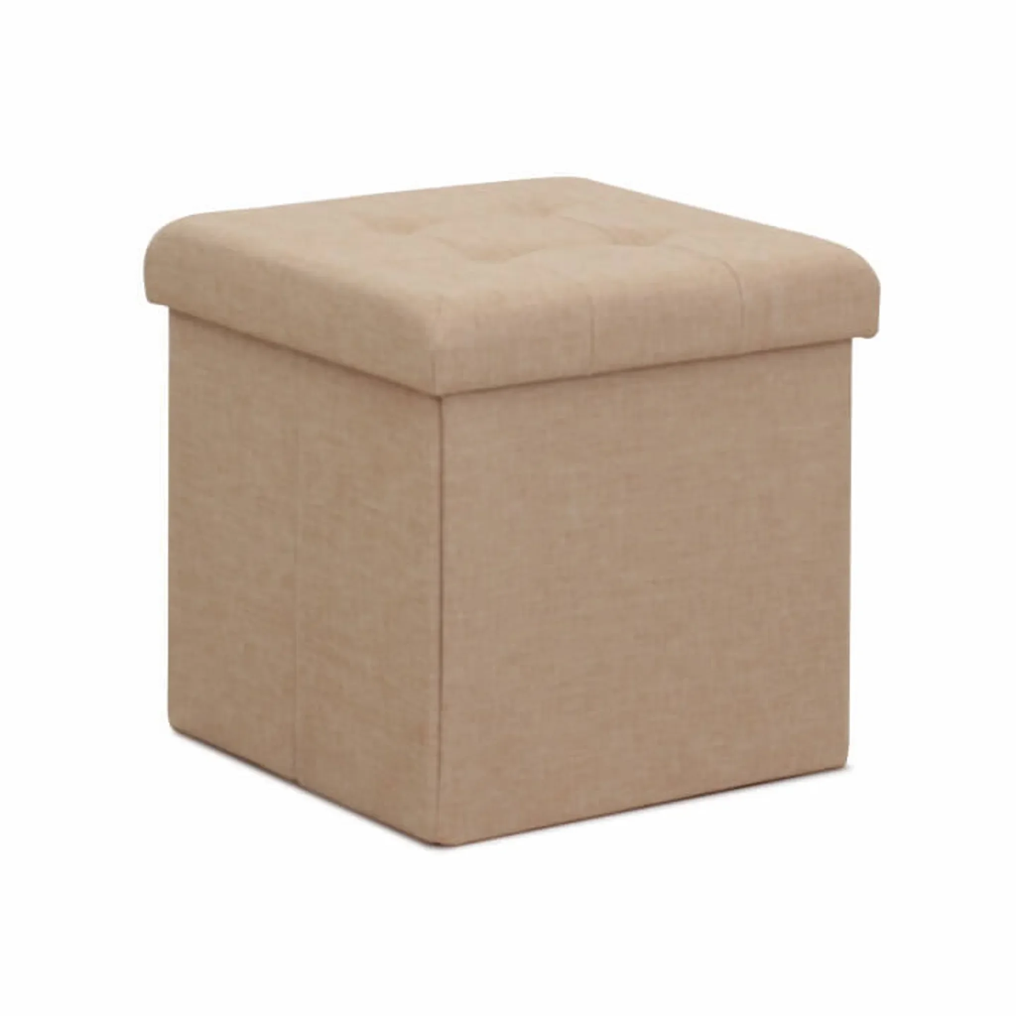 Kompakter und funktionaler Hocker für Wohnzimmer oder Schlafzimmer, stilvoll in Beige mit praktischem Stauraum und komfortabler Sitzhöhe von 38 cm.