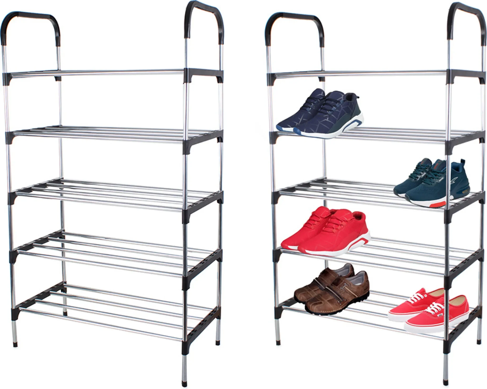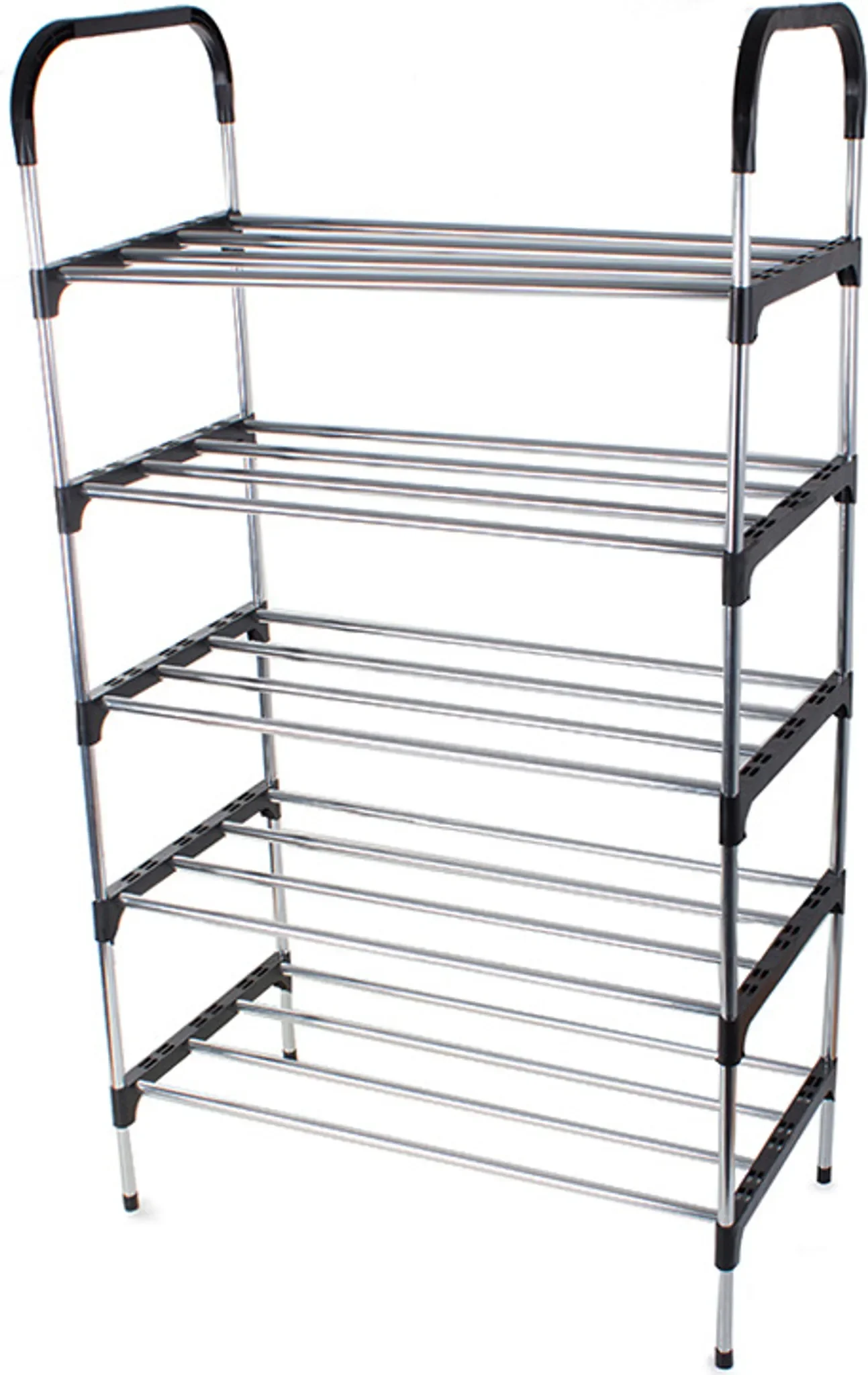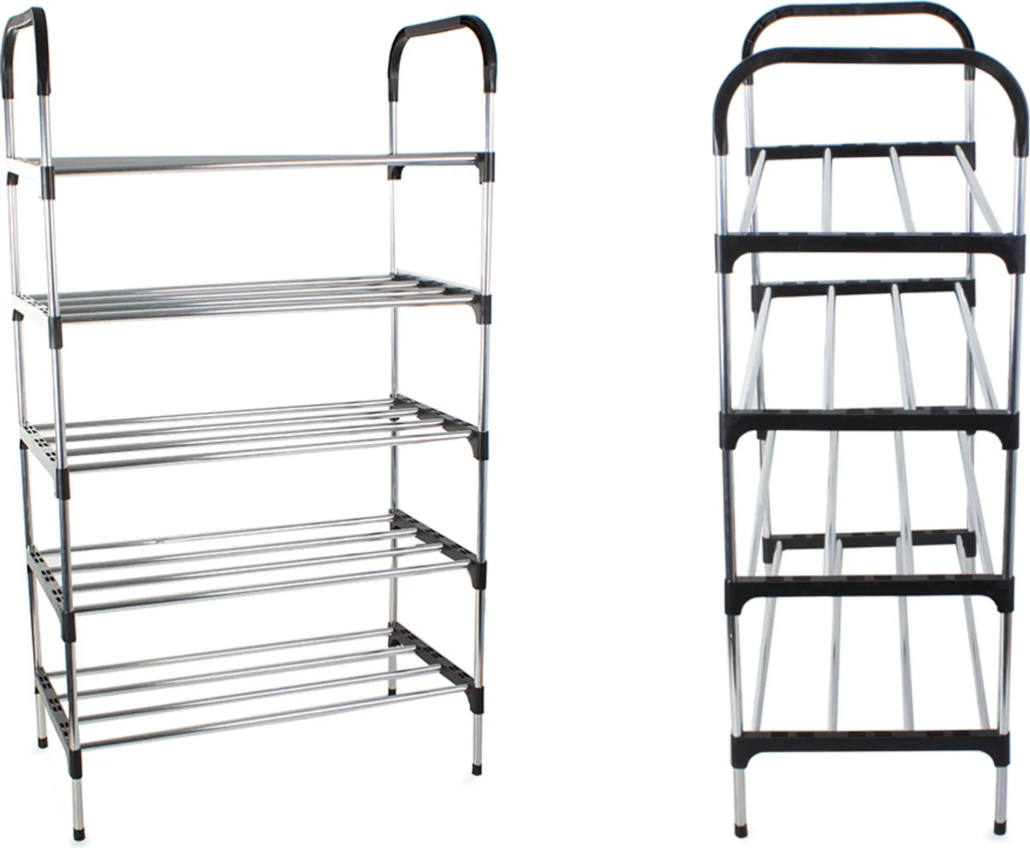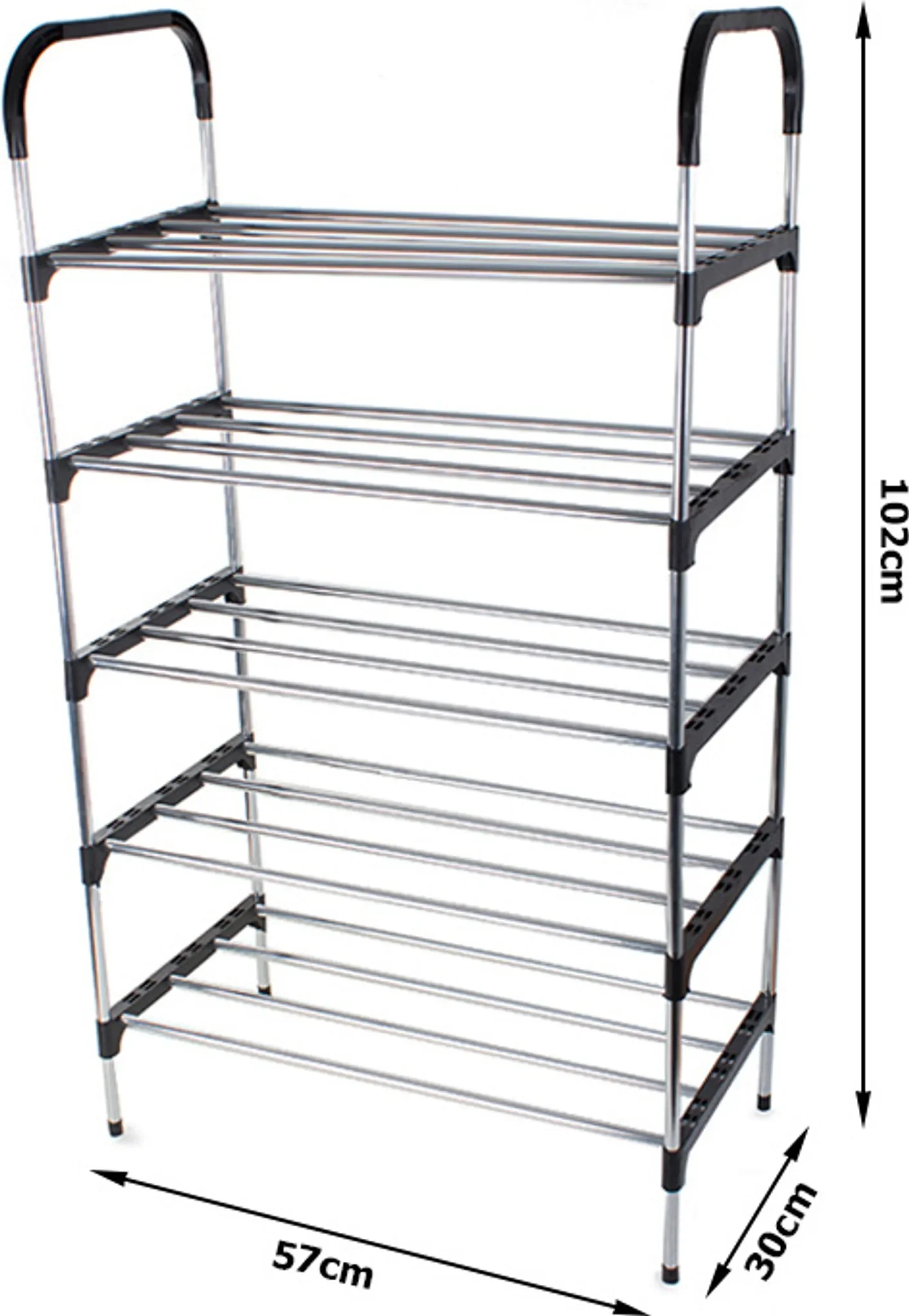 Das praktische Schuhregal Ver018 bietet 5 Ebenen zur übersichtlichen Aufbewahrung von bis zu 15 Paar Schuhen. Dank seines schlanken Designs passt es ideal in Flur, Schlafzimmer oder Ankleidezimmer. Die silberfarbenen Querstreben sorgen für Stabilität und verleihen dem Regal eine moderne Optik.