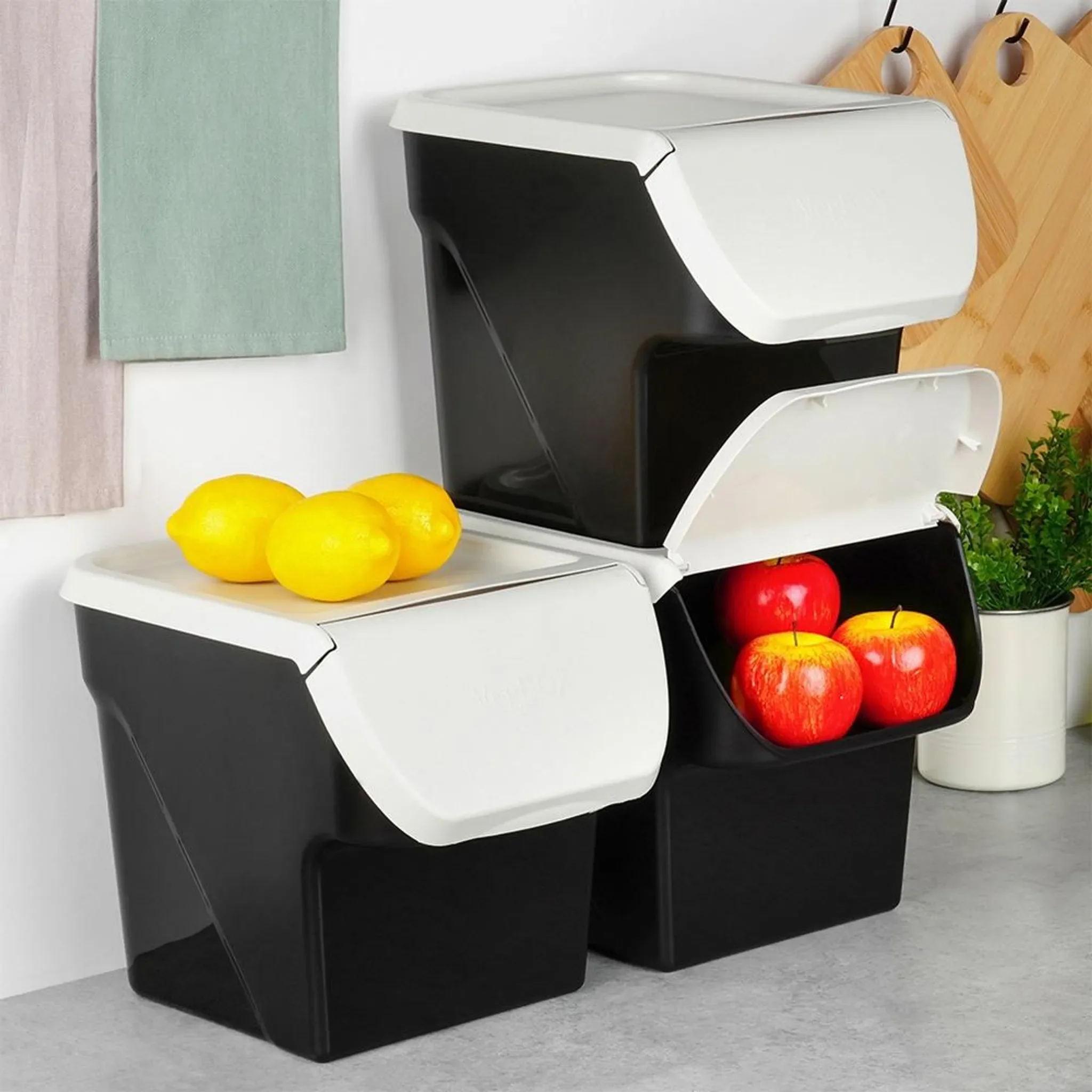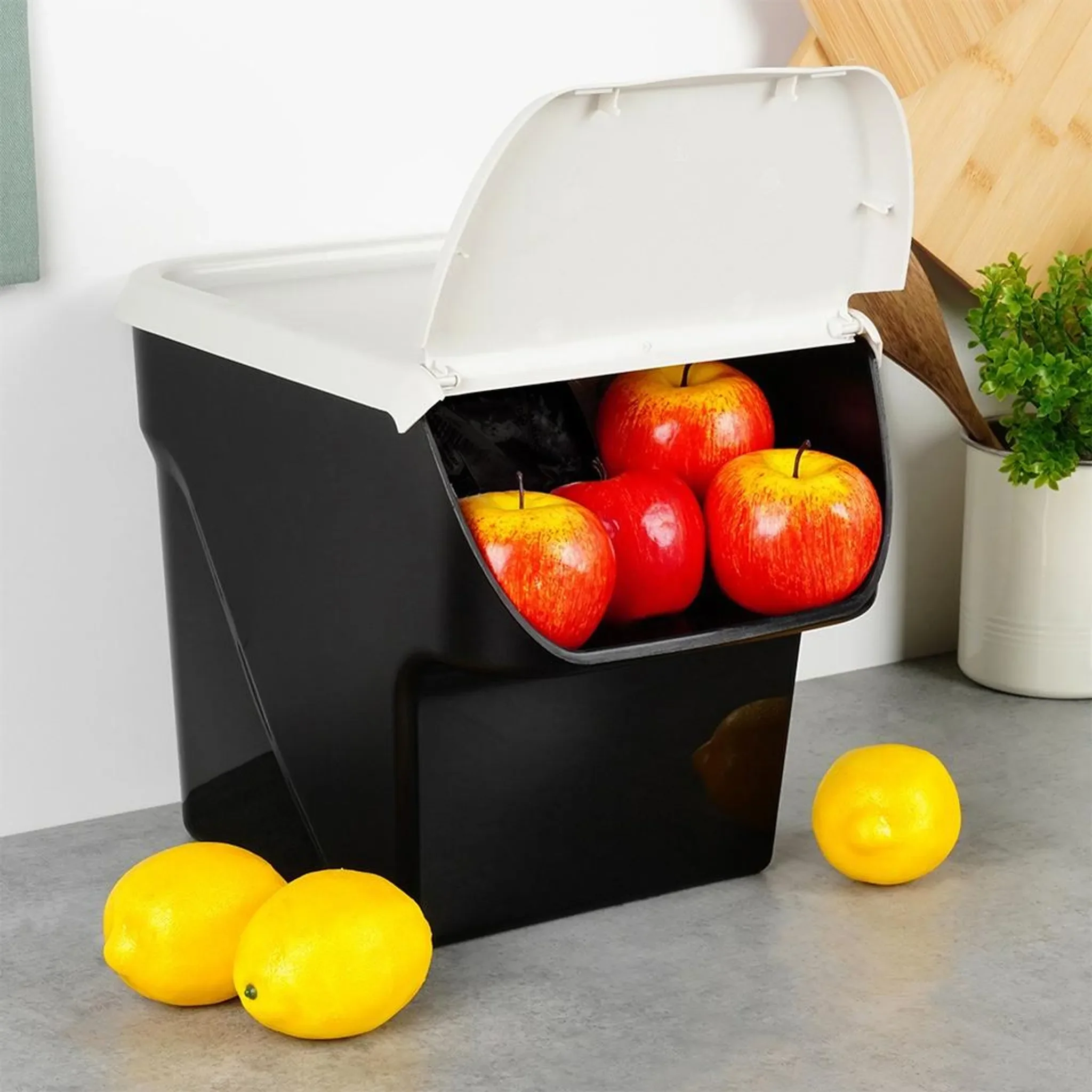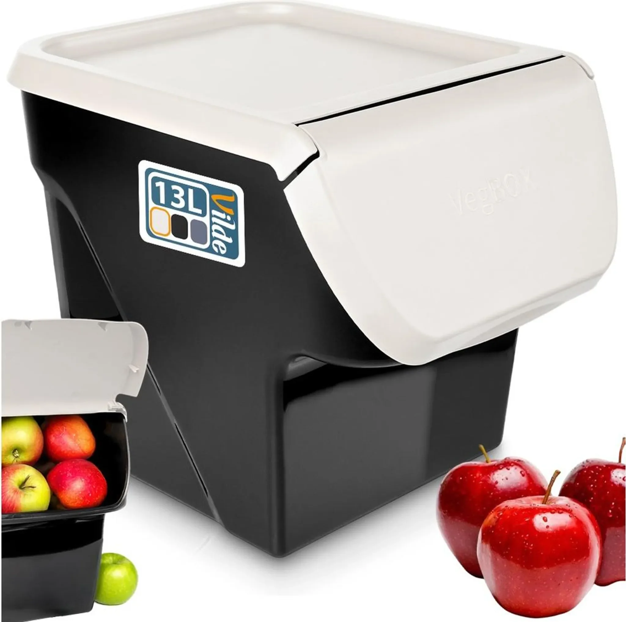 Der Vilde Aufbewahrungsbehälter aus hochwertigem Kunststoff ist ideal zur Lagerung von Obst, Gemüse, Zwiebeln, Kartoffeln oder Knoblauch. Mit einem Fassungsvermögen von 13 Litern, abnehmbarem Deckel mit Öffnungsklappe und lebensmittelechter Qualität sorgt er für längere Frische und optimale Übersicht in der Küche. Stapelbar und vielseitig einsetzbar – auch für Mülltrennung oder Aufbewahrung in Garage oder Werkstatt.