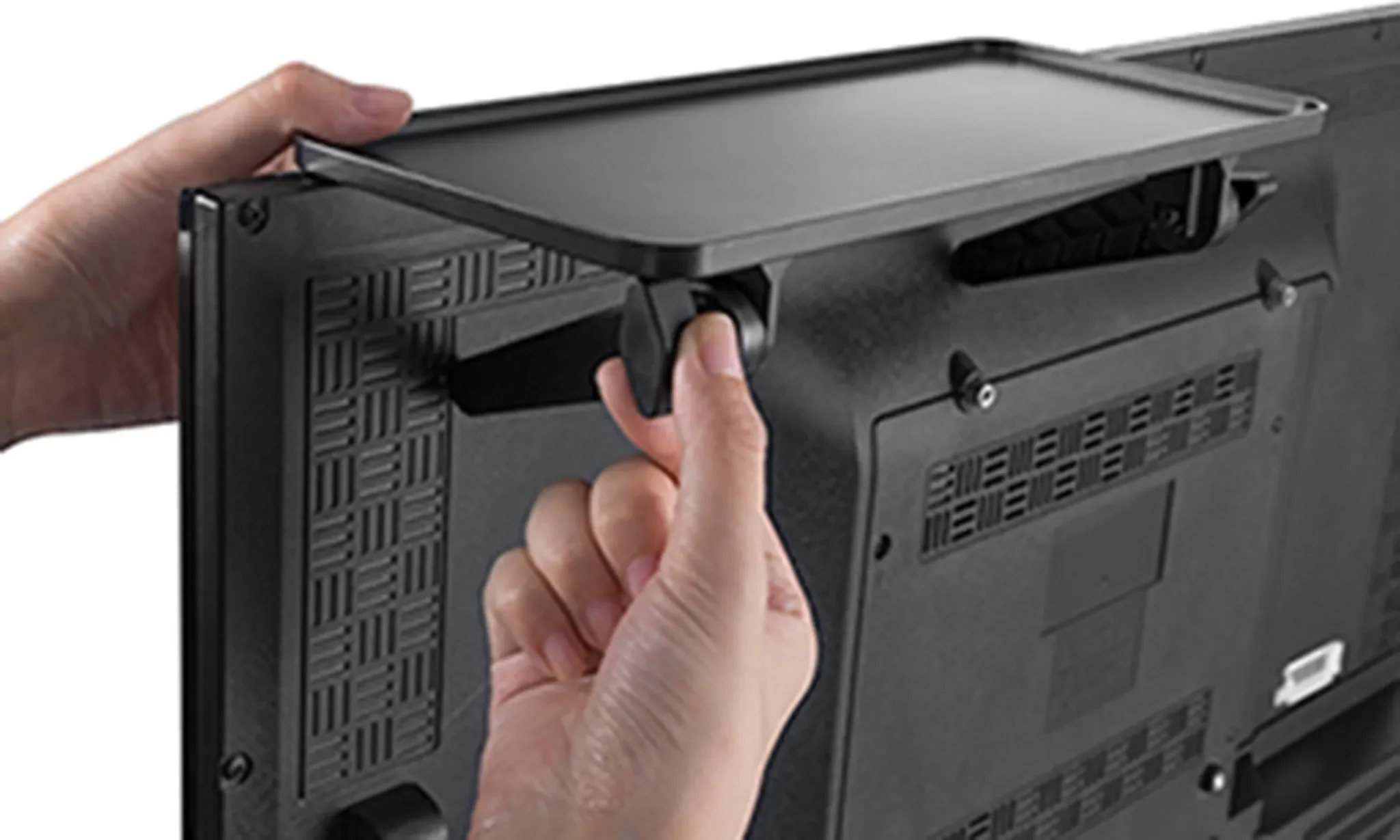 Das Regal lässt sich flexibel an den meisten Fernsehern befestigen. Ein praktischer Drehknopf arretiert das Bein in der gewünschten Position, sodass das Regal stabil hält und einfach auf- und abgebaut werden kann – ganz ohne Werkzeug.